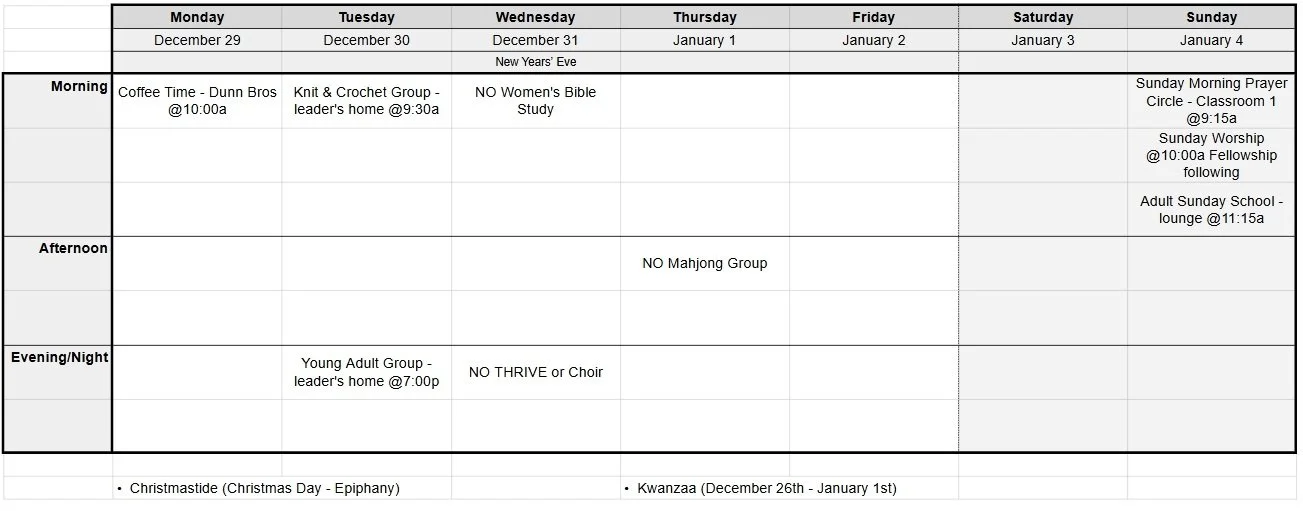 For additional information on small groups to join or volunteer opportunities, check out the Small Groups, Community Outreach, or Worship Volunteer pages. If you are interested in starting a small group, please contact Pastor Brenda and/or the church office for additional guidance. See below for the Church Calendar for this week and next.